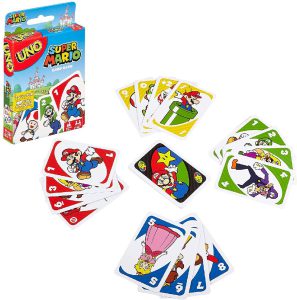 Speel een speciale versie van het klassieke UNO spel met Mario, Luigi en hun vrienden! Deze speciale editie bevat een Mario Super Star-kaart waardoor je onoverwinnelijk wordt. Wanneer een andere speler een Neem-twee of Neem-vier kaart speelt, kun jij de Super Star-kaart inzetten en moet de vorige speler zelf twee of vier kaarten pakken. Het doel is om als eerste speler al je kaarten kwijt te raken en 500 punten te scoren om te winnen. Inclusief 112 kaarten en spelregels. Geschikt voor 2 tot 10 spelers vanaf 7 jaar oud.